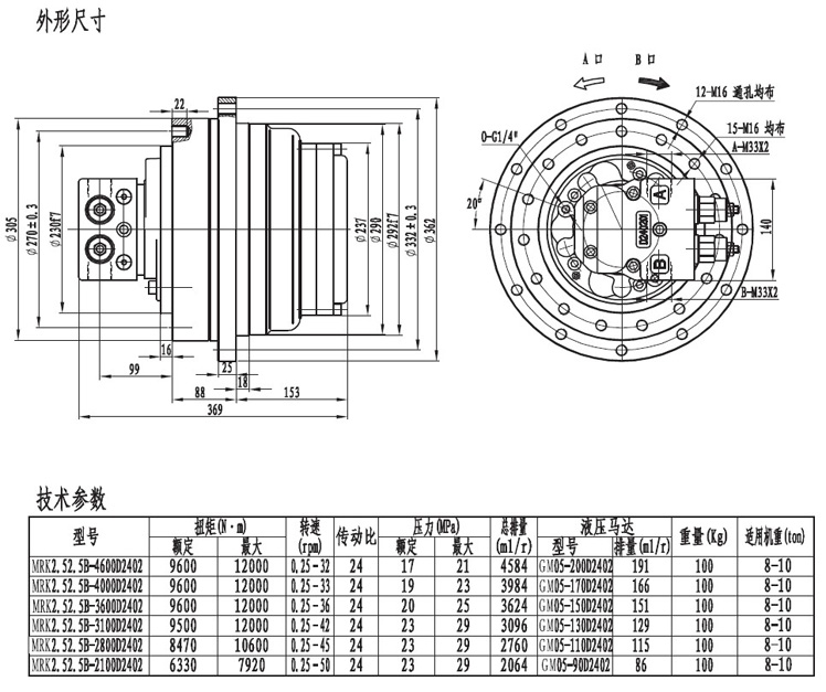 • MRK2.52.5系列履帶(車輪)行走減速機(jī)適用于小挖機(jī)載重4-6噸,鉆機(jī)6-8噸及8-10噸,輸出扭矩從6000NM—12000NM不等。采用兩級(jí)減速,使輸出扭矩加大的情況下外形尺寸更加緊湊。輸出轉(zhuǎn)速從0.25---30R/Min均勻穩(wěn)定的低速工作。
