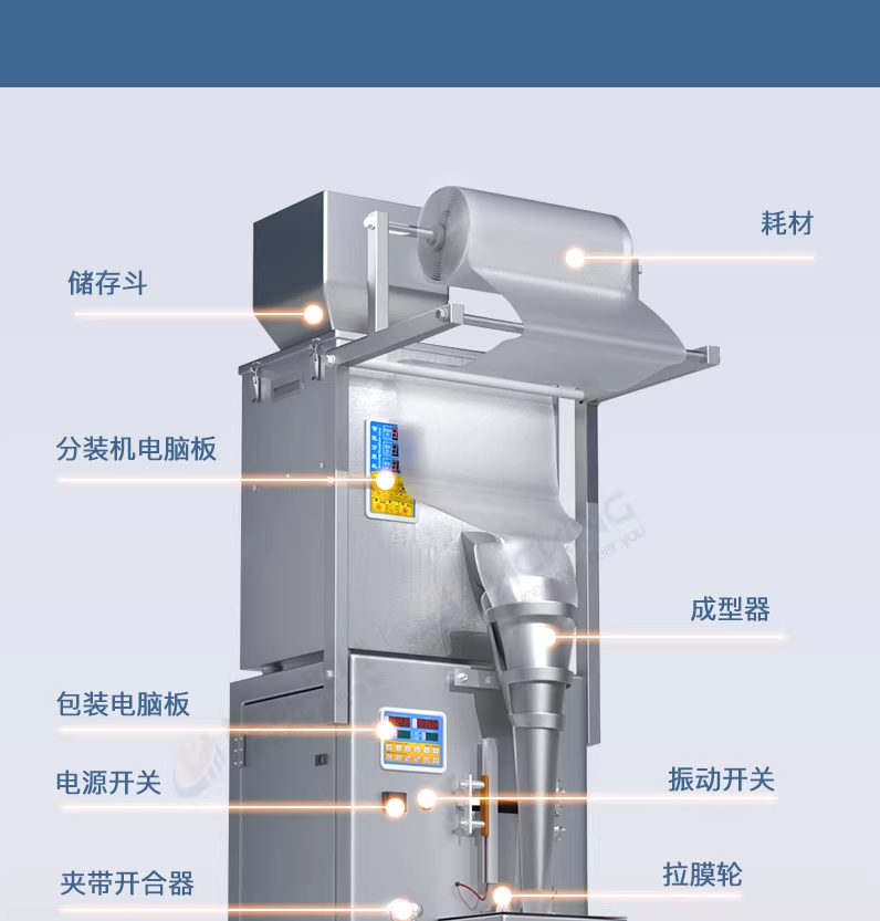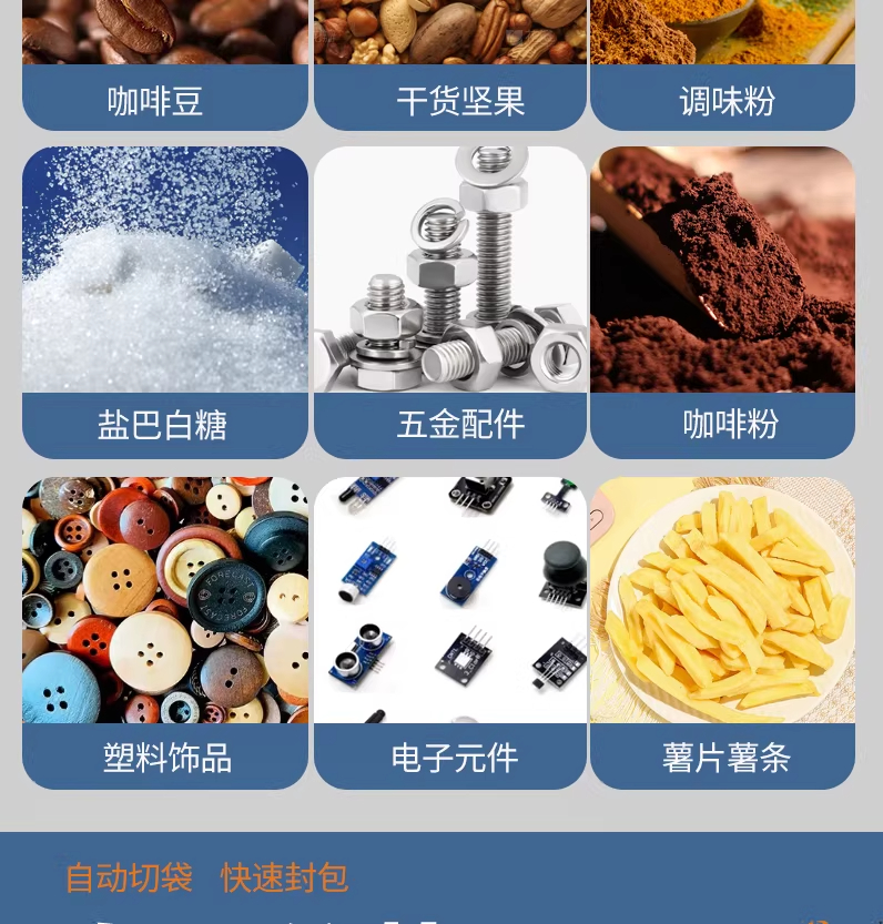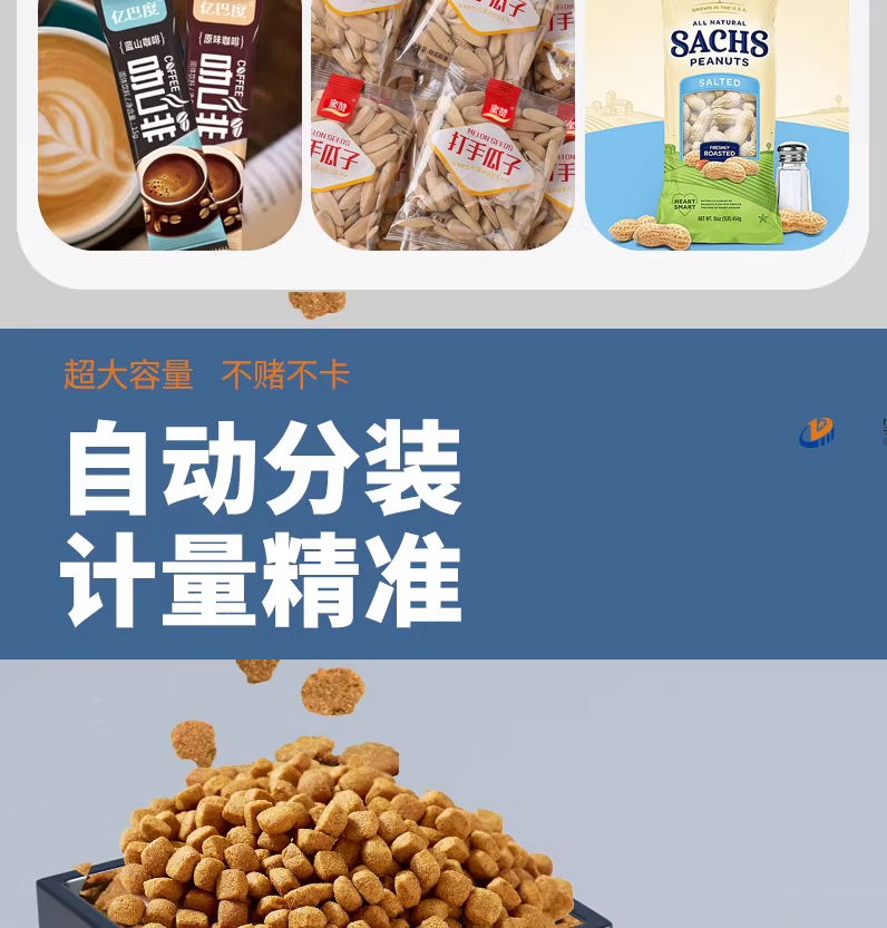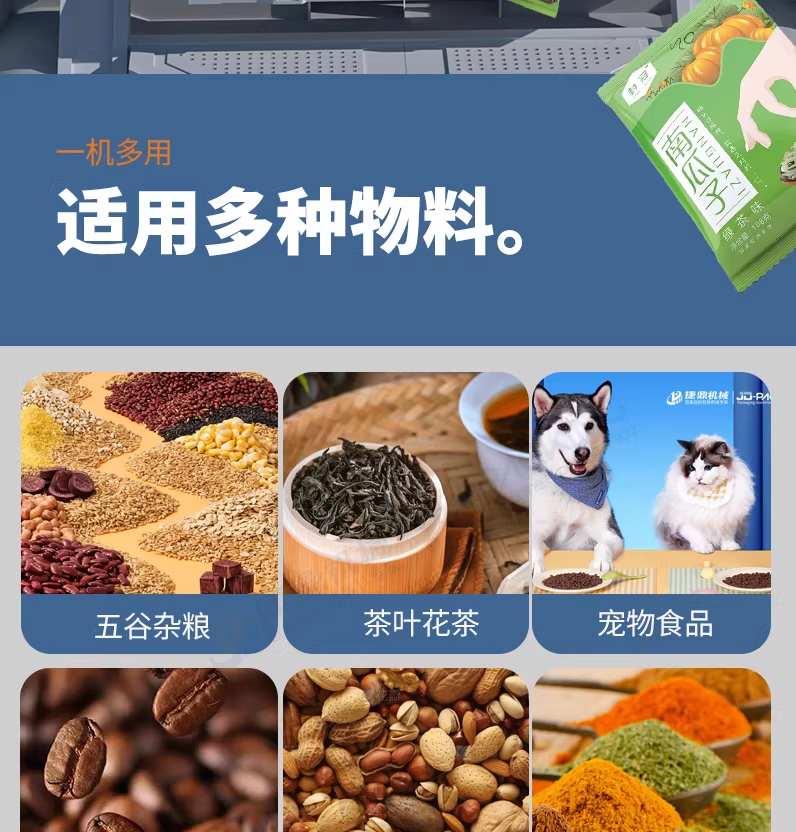 捷鼎生產(chǎn)的200克電動(dòng)小型包裝機(jī),適用于:大米、小米、茶葉、堅(jiān)果、果干、膨化食品、五谷雜糧、蔬菜種子,貓糧狗糧、寵物食品、化肥飼料、堅(jiān)果瓜子、玉米種子、咖啡豆、咖啡粉、面粉、胡椒粉、調(diào)味粉等顆粒、粉末、物料等的定量、稱(chēng)重、灌裝,封口